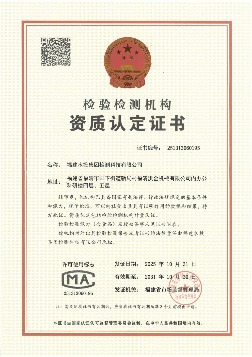 近日,福建水投集團(tuán)檢測科技有限公司順利通過水質(zhì)指標(biāo)檢測能力CMA資質(zhì)認(rèn)證,涵蓋生活飲用水、水和廢水2大類74個項目,...